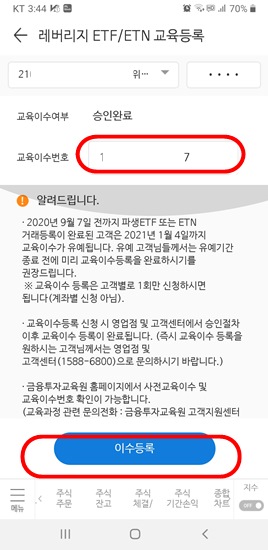 다음페이지의 레버리지 ETH/ETN교육등록에서 교육이수번호 입력하고 이수등록하면 된다.