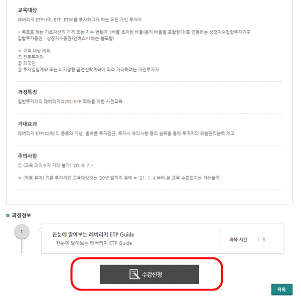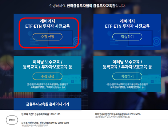 첫 화면 왼쪽의 레버리지 ETH/ETN투자자 사전교육 수강신청 버튼을 누른다.