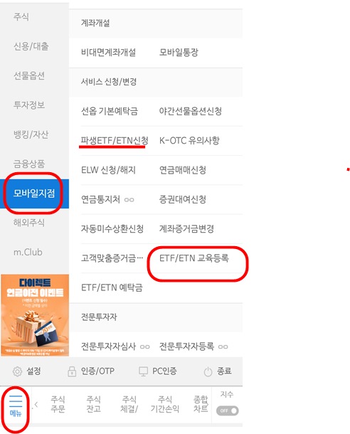 메뉴->모바일지점->ETH/ETN교육등록 순서로 누르시면되는데요. (파생ETH/ETN신청버튼 아니예요)