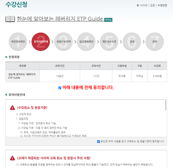 수강신청버튼->유의사항안내 체크표시ㅁ 모두 한다