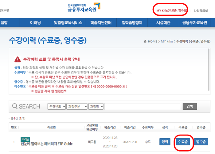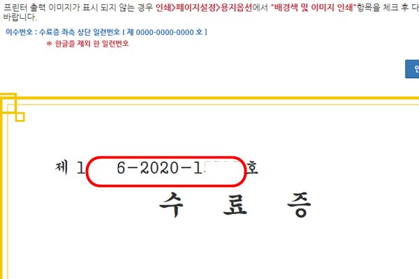 그러면 수료증이 뜨는데 굳이 프린터하지 않아도 된다. 맨 위의 제~~호까지 번호만 별도로 적어두면 된다.