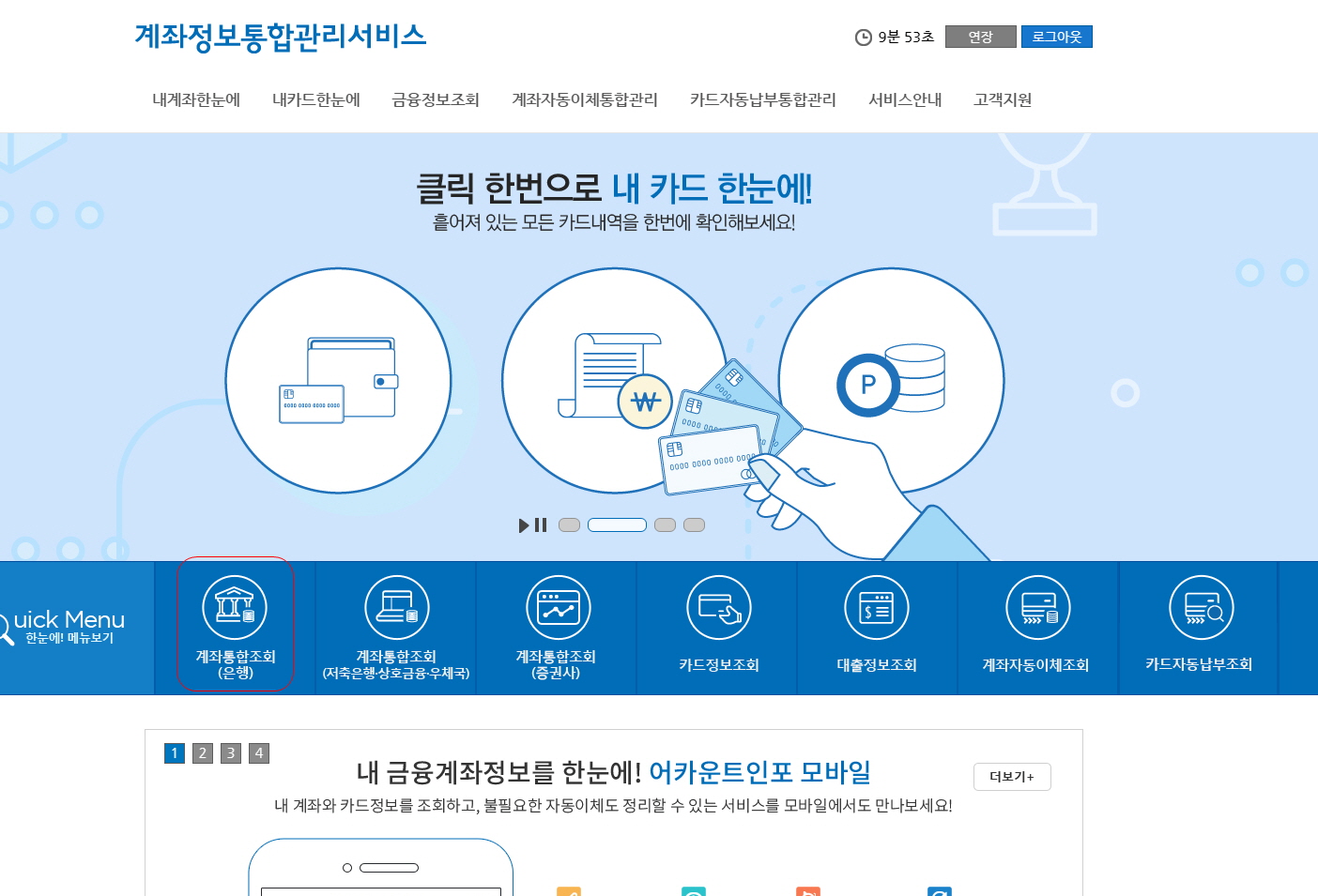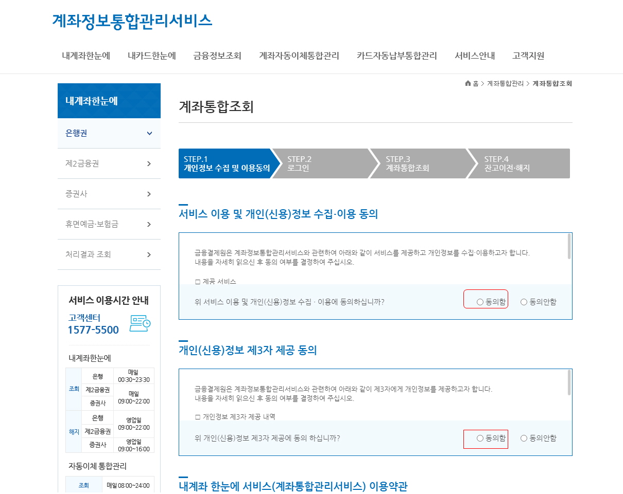 3. 그러면 계좌정보통합관리서비스라는 화면이 뜨는데요. 아래 빨간 동그라미 해놓은 그림을 클릭하세요.