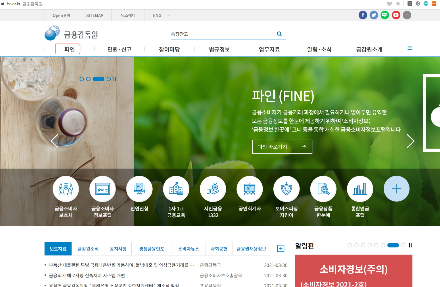 1. 우선 금융감독원에 접속을 하세요. 왼쪽 파인이라고 써진 글을 클릭하세요.