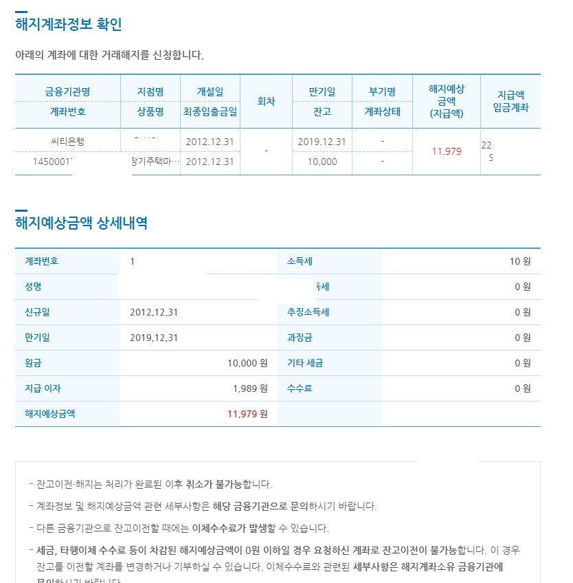 자고있던 계좌 해지후 해지명세서가 팝업되고, 제가 지정한 계좌로 해당 금액이 송금되었습니다. ^^