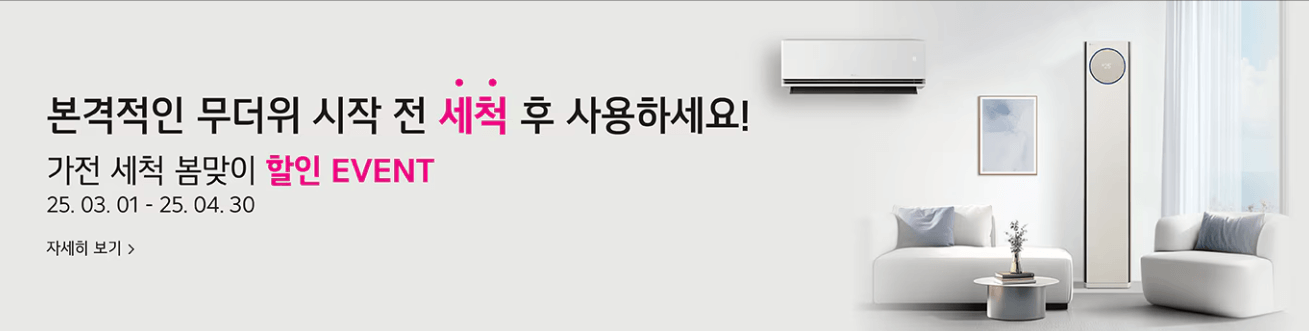 | LG전자 | 3/10 ~ 4/30 | 홈페이지 / 1544-7777 | 3대까지 무상 | 세척 할인, 시스템에어컨 포함(B2C) |